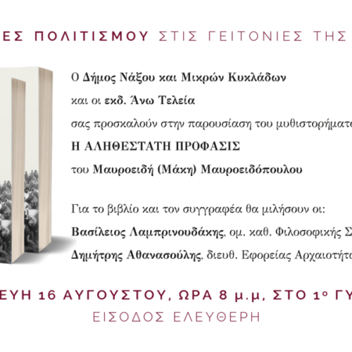 Ο Δήμος Νάξου και Μικρών Κυκλάδων σας προσκαλεί στην παρουσίαση του βιβλίου “Αληθεστάτη πρόφασις” του Μάκη Μαυροειδόπουλου, σήμερα Παρασκευή 16 Αυγούστου 2024, στις 20:00, στο 1ο Γυμνάσιο Νάξου. Το βιβλίο θα παρουσιάσει ο Ομότιμος Καθηγητής ΕΚΠΑ ο Βασίλης Λαμπρινουδάκης και ο Διευθυντής της Εφορείας Αρχαιοτήτων Κυκλάδων Δημήτρης Αθανασούλης. Η παρουσία σας θα μας τιμήσει ιδιαίτερα! Δήμος […]