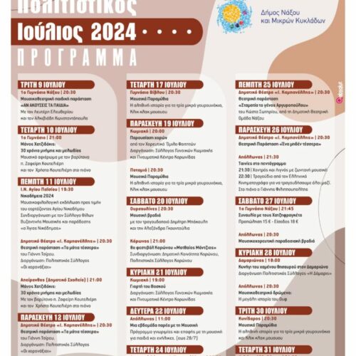 Ο Δήμος Νάξου και Μικρών Κυκλάδων σάς καλωσορίζει στις «Βεγγέρες Πολιτισμού» στις γειτονιές των νησιών μας. Δείτε το πρόγραμμα των εκδηλώσεων για τον Ιούλιο Τετάρτη 10 Ιουλίου 1ο Γυμνάσιο | 21:00 Μάνος Χατζιδάκις: 30 χρόνια μνήμης και μελωδίας Με τον βαρύτονο π. Ζαφείρη Κουτελιέρη και τον Χρήστο Κουτελιέρη στο πιάνο Το δεξιοτεχνικό παίξιμο του εξαιρετικού νεαρού πιανίστα Χρήστου […]