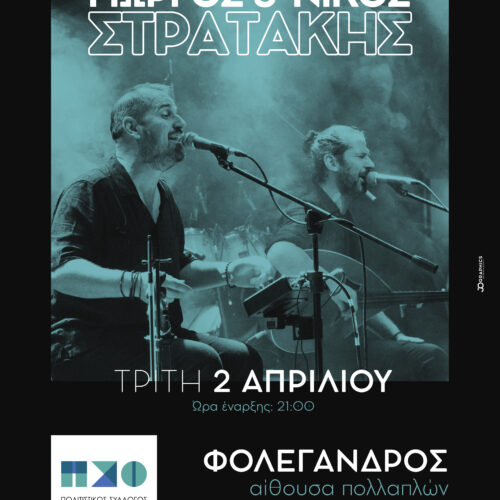 Ο Πολιτιστικός Σύλλογος Φολεγάνδρου μας προσκαλεί όλους στην συναυλία του Γιώργου και Νίκου Στρατάκη την Τρίτη 2 Απριλίου στην αίθουσα πολλαπλών χρήσεων του Δήμου Φολεγάνδρου