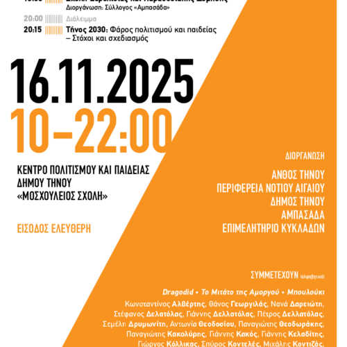 ΔΕΛΤΙΟ ΤΥΠΟΥ ΗΜΕΡΙΔΑΣ Τήνος 2030: Στόχοι και Προοπτικές Βιώσιμης Ανάπτυξης μέσα από την Εκπαίδευση 16 Νοεμβρίου, 10:00-22:00 ΚΕΝΤΡΟ ΠΟΛΙΤΙΣΜΟΥ ΚΑΙ ΠΑΙΔΕΙΑΣ ΔΗΜΟΥ ΤΗΝΟΥ «ΜΟΣΧΟΥΛΕΙΟΣ ΣΧΟΛΗ» ΕΙΣΟΔΟΣ ΕΛΕΥΘΕΡΗ Στις 16 Νοεμβρίου ξεκινά ένα δύσκολο, απαιτητικό και όμορφο ταξίδι. Ο στόχος του: μια πραγματικά βιώσιμη Τήνος για τους κατοίκους της, ένα σπάνιο κόσμημα για τους επισκέπτες της, […]