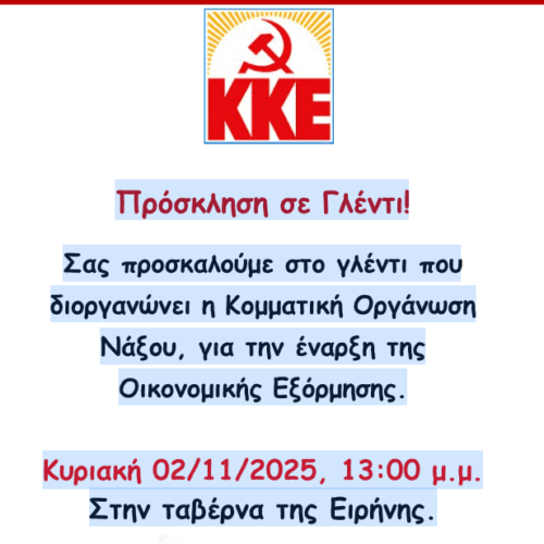 ΠΡΟΣΚΛΗΣΗ Η Κομματική Οργάνωση Νάξου του Κ.Κ.Ε. διοργανώνει γλέντι για την έναρξη της Οικονομικής Εξόρμησης (Νοέμβρης-Δεκέμβρης 2025), το οποίο θα πραγματοποιηθεί στην ταβέρνα «Της Ειρήνης» στην παραλιακή της Χώρας, την Κυριακή 2 Νοέμβρη από τις 13:00 μ.μ. Η εκδήλωση θα περιλαμβάνει ζωντανή μουσική και καλό φαγητό!!!