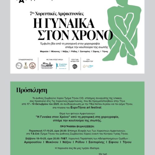 7ες Χορευτικές Αμφικτυονίες 2025 ΕυρυΤήνια Art Festival 2025 Η Γυναίκα στο Χρόνο Tin_Talk | Σπάω την Κουλτούρα της Σιωπής 17-19 Οκτωβρίου | Τήνος Έτσι νικάει το καλό: ένα βήμα τη φορά… Τόσα βήματα, όσα και η πίστη μας ότι μπορεί να γίνει καλύτερος ο κόσμος. – Γ.Ν.Ρ Από τις 17 έως τις 19 Οκτωβρίου 2025, […]