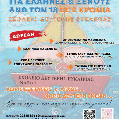 Από το Σχολείο Δεύτερης Ευκαιρίας ανακοινώνεται ότι συνεχίζονται οι εγγραφές για το Σχολικό Έτος 2023-24 και θα διαρκέσουν έως τις 15/10/2023. Το Σ.Δ.Ε. λειτουργεί στις Κυκλάδες με έδρα τη Σύρο και τμήματα στα νησιά Νάξο και Σαντορίνη. Το Σχολείο Δεύτερης Ευκαιρίας: – Απευθύνεται μόνο σε ενήλικες που δεν έχουν ολοκληρώσει την υποχρεωτική εκπαίδευση. […]
