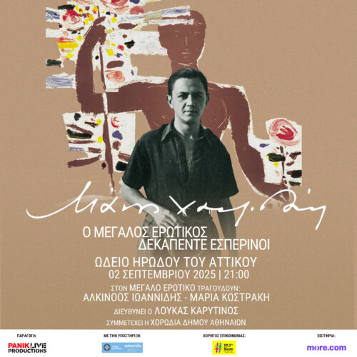 ΜΑΝΟΣ ΧΑΤΖΙΔΑΚΙΣ Ο ΜΕΓΑΛΟΣ ΕΡΩΤΙΚΟΣ – ΔΕΚΑΠΕΝΤΕ ΕΣΠΕΡΙΝΟΙ Ωδείο Ηρώδου Αττικού – Τρίτη 2 Σεπτεμβρίου Τραγουδούν: Αλκίνοος Ιωαννίδης, Μαρία Κωστράκη Μουσική Διεύθυνση: Λουκάς Καρυτινός Συμμετέχει η χορωδία του Δήμου Αθηναίων Εισιτήρια: https://www.more.com/gr-el/tickets/music/manos-xatzidakis-o-megalos-erotikos-dekapente-esperinoi Ο Μεγάλος Ερωτικός και οι Δεκαπέντε Εσπερινοί, δύο από τα εμβληματικά έργα του Μάνου Χατζιδάκι, παρουσιάζονται σε μία μοναδική βραδιά στο Ωδείο Ηρώδου Αττικού, την Τρίτη 2 Σεπτεμβρίου στις 21:00, σε […]