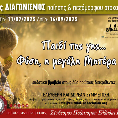 «Παιδί της γης… Φύση, η μεγάλη Μητέρα του» 15ος Διεθνής Διαγωνισμός Ποίησης & Πεζόμορφου Στοχασμού Σύνδεσμος Πολιτισμού Ελλάδας Κύπρου (ΣΠΕΚ) Υπό την αιγίδα του Stelios Philanthropic Foundation Ο Σύνδεσμος Πολιτισμού Ελλάδας Κύπρου (ΣΠΕΚ) προκηρύσσει τον 15ο Διεθνή Διαγωνισμό Ποίησης & Πεζόμορφου Στοχασμού, με θέμα: «Παιδί της γης… Φύση, η μεγάλη Μητέρα του» ��️ Διάρκεια […]