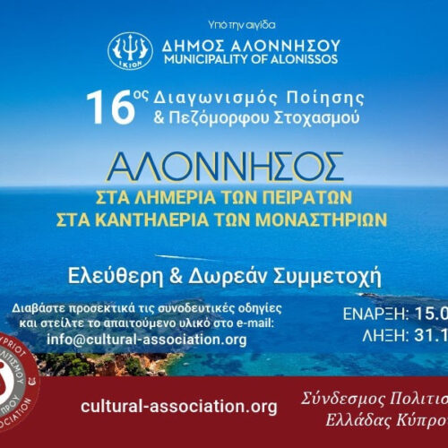 16ος Διεθνής Διαγωνισμός Ποίησης & Πεζόμορφου Στοχασμού Συνδέσμου Πολιτισμού Ελλάδας Κύπρου, “ΑΛΟΝΝΗΣΟΣ – Στα λημέρια των πειρατών, στα καντηλέρια των μοναστηριών” Διάρκεια: 15 Ιουλίου – 31 Οκτωβρίου 2025 Δωρεάν Συμμετοχή | Ανοιχτός σε Όλο τον Κόσμο Γλώσσες: Ελληνικά ή Αγγλικά Κάλεσμα σε δημιουργούς – από όπου κι αν βρίσκεστε! Ο Σύνδεσμος Πολιτισμού Ελλάδας Κύπρου (ΣΠΕΚ), υπό την αιγίδα του […]