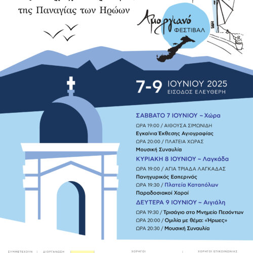 Ο Δήμος Αμοργού σε συνεργασία με την Ένωση Ξενοδόχων και Ιδιοκτητών Ενοικιαζόμενων Δωματίων Αμοργού και τον Δήμο Τρίπολης συνδιοργανώνουν το 2ο Αμοργιανό Φεστιβάλ, με θέμα: «Ανέγνωρες μορφές της Υπερμάχου Στρατηγού, της Παναγίας των Ηρώων», το οποίο είναι αφιερωμένο στους Ήρωες, που με τις πράξεις τους τίμησαν και «ουκ καταίσχυναν τα όπλα τα ιερά» συμβάλλοντας στην […]