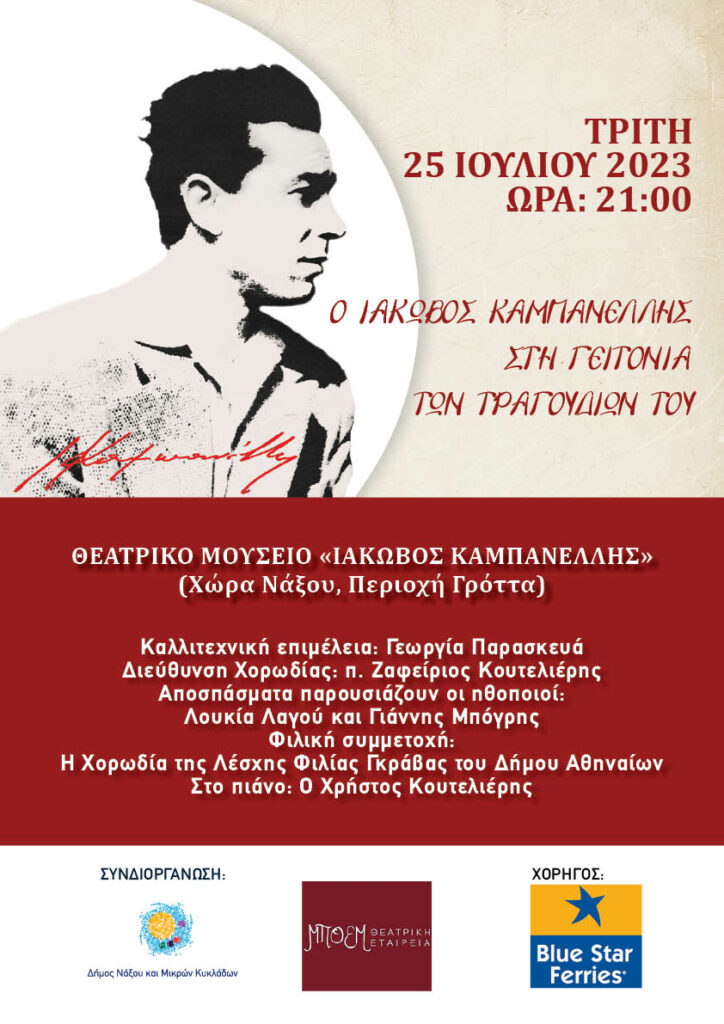Ο Δήμος Νάξου και Μικρών Κυκλάδων σε συνεργασία με τη Θεατρική Εταιρεία ΜΠΟΕΜ και τη Λέσχη Φιλίας Γκράβας του Δήμου Αθηναίων, παρουσιάζουν μια βραδιά με τραγούδια και αποσπάσματα από τα έργα του σπουδαίου θεατρικού συγγραφέα Ιάκωβου Καμπανέλλη, την Τρίτη 25 Ιουλίου, στις 21:00, στο Θεατρικό Μουσείο «Ι. Καμπανέλλης». Με αφορμή τη στιχουργική του ιδιότητα, ο […]