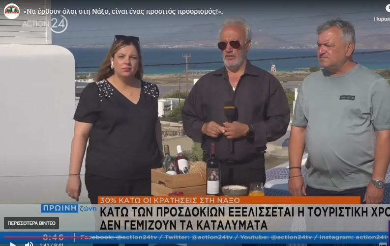 Προς το παρόν δεν είναι ικανοποιητικά τα πράγματα όσον αφορά στην τουριστική κίνηση στη Νάξο (με τις κρατήσεις να είναι τουλάχιστον 30% κάτω σε σχέση με πέρυσι και τους Έλληνες επισκέπτες να είναι λίγοι), όπως παραδέχθηκαν μιλώντας στην «Πρωινή Ζώνη» του Action 24 ο Πρόεδρος της Ένωσης Αγροτικών Συνεταιρισμών Νάξου, Δημήτρης Καπούνης, η ιδιοκτήτρια του ξενοδοχείου 18 Grapes Hotel, Μαρία Καπρή και ο ταξιδιωτικός […]